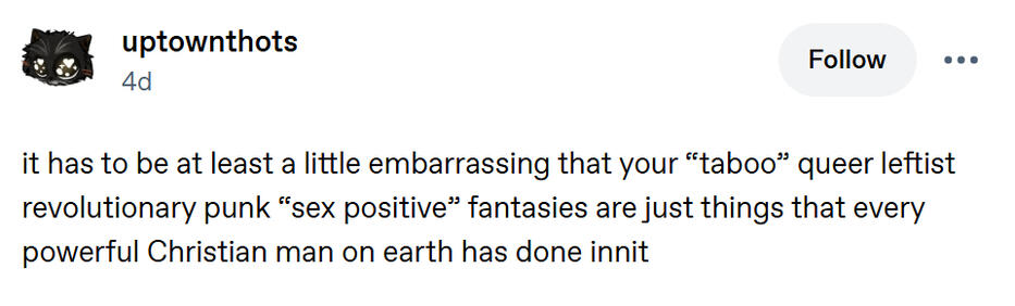 if you describe yourself as "proship/profic/propara" or "problematic" i wont like you bc those spaces tend to tolerate and encourage porn of the content in the above point, and people identifying as that have repeatedly crossed my boundaries. im sick of yall. our liberation does not hinge on acceptance of right-wing systems of abuse.